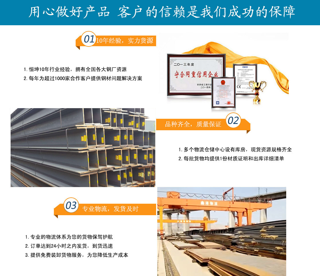蘭州恒坤商貿(mào)有限公司立足于鋼材貿(mào)易,主要經(jīng)營:鋼板、角鋼、工字鋼、槽鋼、H型鋼、鍍鋅槽鋼、鍍鋅角鋼、鍍鋅板、鍍鋅卷、鍍鋅圓鋼、鍍鋅工字鋼多種型號鋼材產(chǎn)品。多年來,我公司始終堅持質(zhì)量第一,信譽(yù)至上的經(jīng)營方針,與酒鋼、包鋼、八鋼、唐鋼、鞍鋼、萊鋼、兗礦、日照鋼鐵、濟(jì)鋼,成都、天津等多家企業(yè)達(dá)成大批量物資供應(yīng)協(xié)議,并且與省內(nèi)外多家客戶建立了合作關(guān)系。